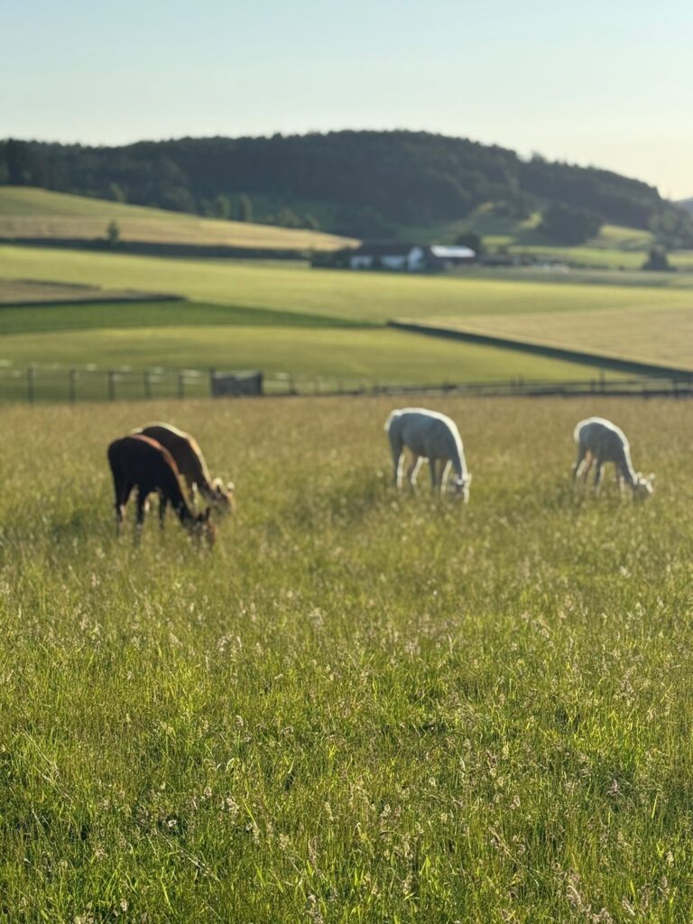 Alpakas sind genügsame Tiere, welche die Grasnarbe schonen und vorsichtig abknabbern. So wird die Weide intakt und gepflegt hinterlassen.
